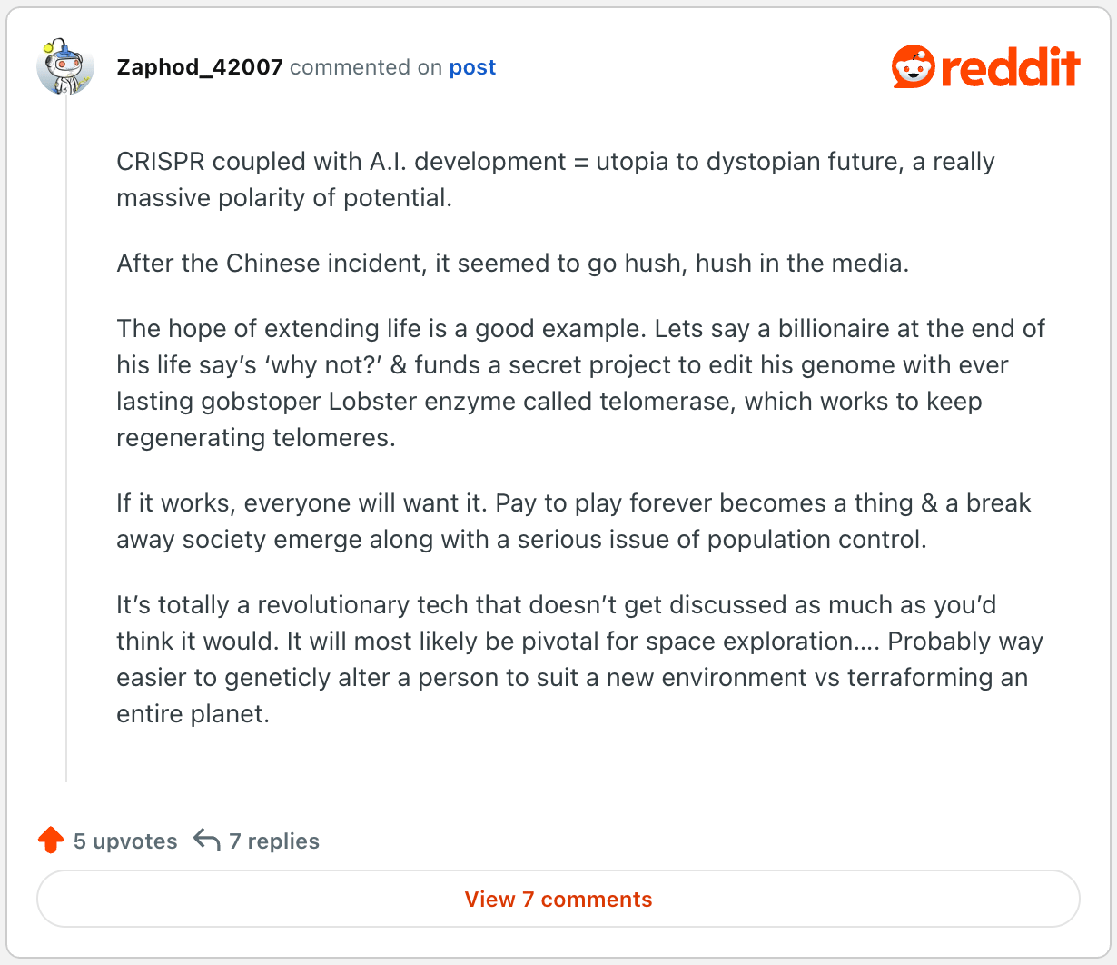 yet other future-defining tech is almost completely unnoticed. not many people are talking about an open-source library for precise genome editing? or genetic LLMs generating better gene combos? or DIY human enhancement kits that make you remember more… or sleep less?